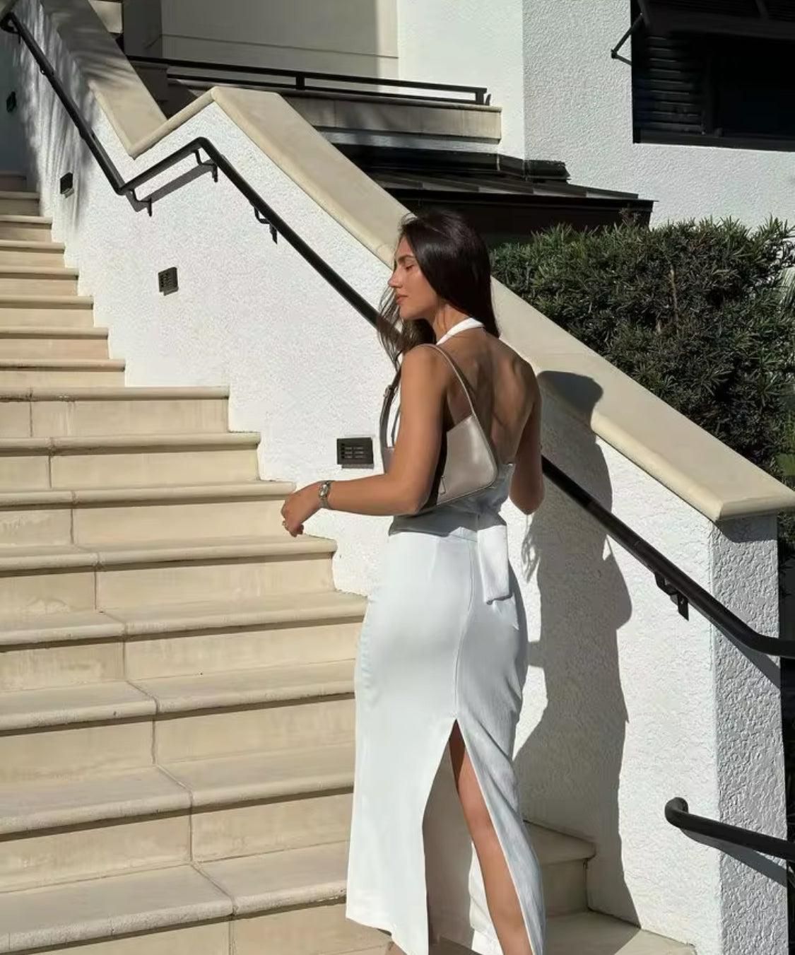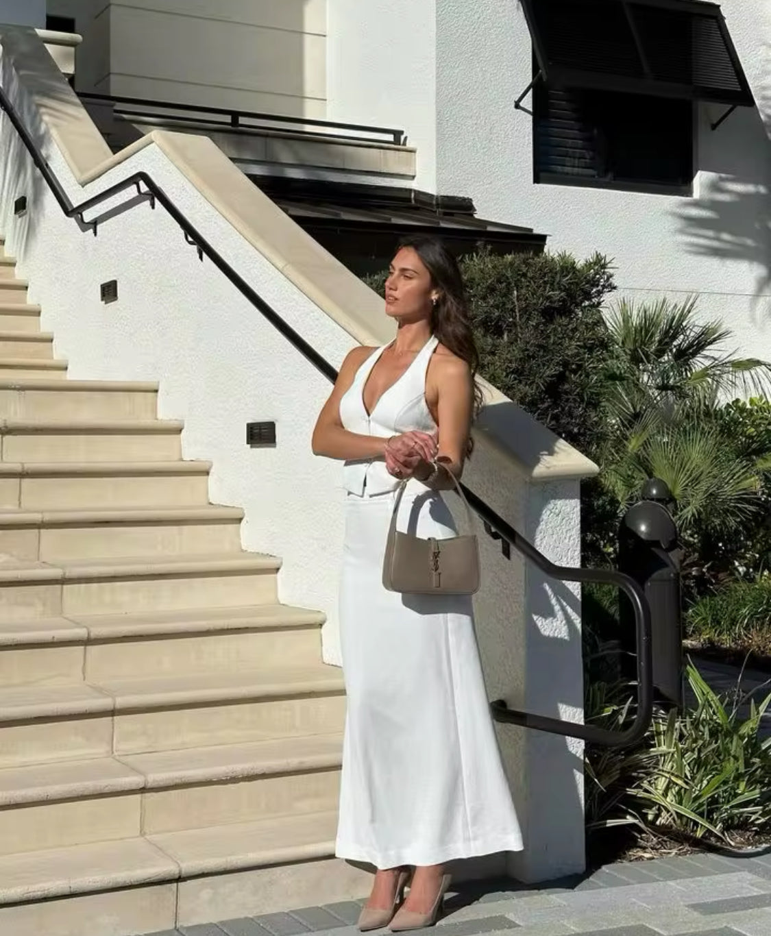 "Elevate your style with our Snow Blossom 2-Piece Set, featuring a Solid Halter Backless Tank Top and High-Waist Split Skirt. This chic ensemble is perfect for warm weather and trendy occasions.